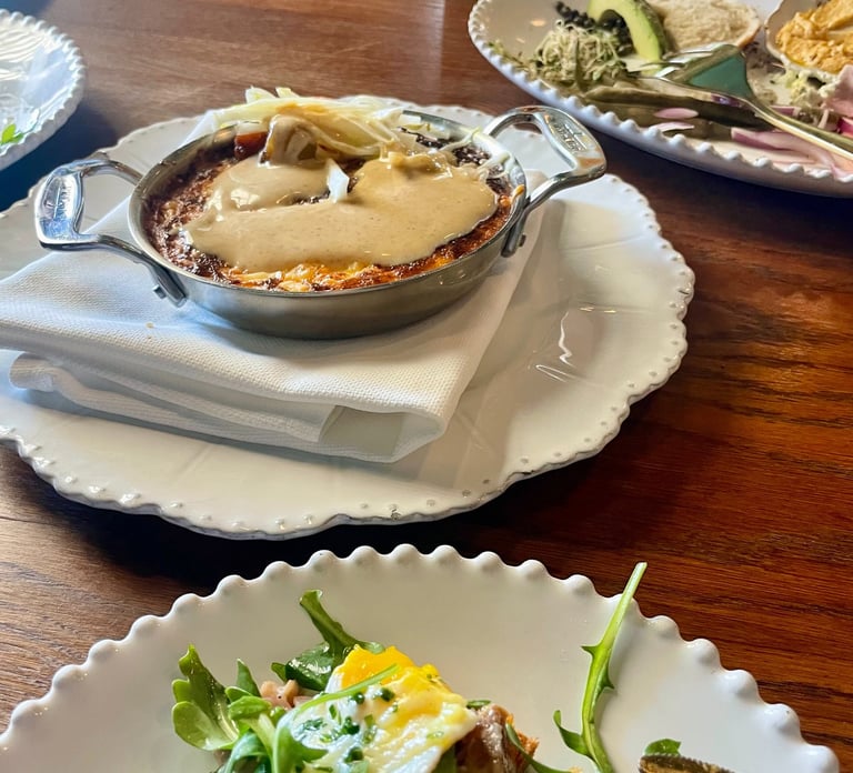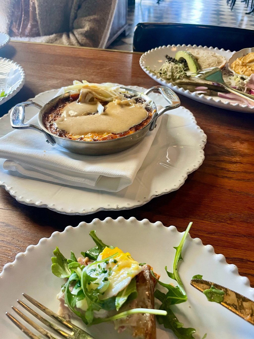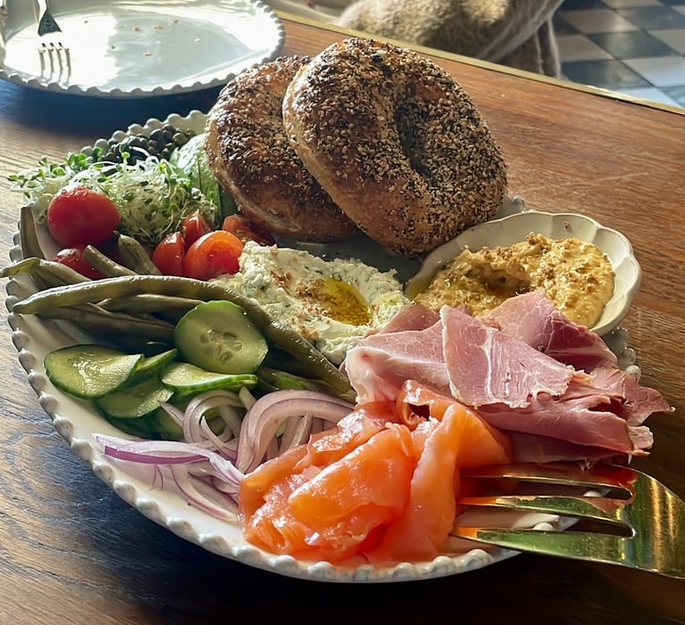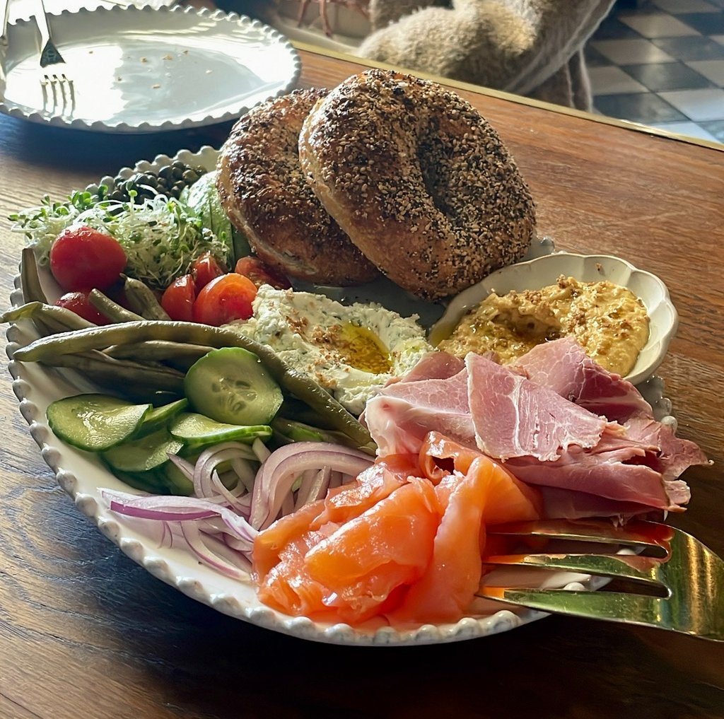 Ambiance aside, the dishes are fresh, savory, and delicious. They’re meant to be served family-style, so we selected a few items to share. This included the bagel plate, which featured freshly made everything bagels paired with smoked salmon, ham, homemade hummus, avocado, and an assortment of vegetables such as cucumbers, tomatoes, and sprouts. The pastries are baked fresh daily, and the chocolate croissant was buttery and flaky. We also ordered the croque madame, which came with smoked ham, a sunny-side-up egg, and sliced Gruyère. Overall, it was a generous amount of food, and we left very satisfied with both the meal and the experience.