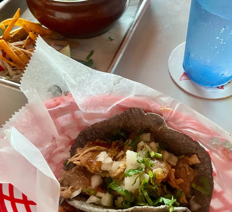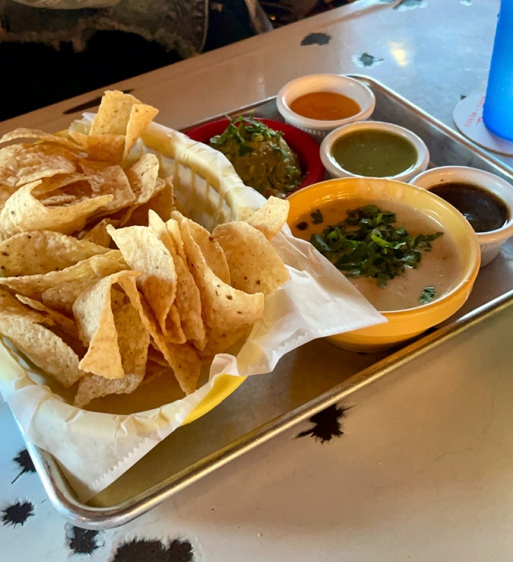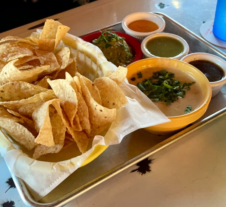 De Nada Cantina serves Tex-Mex cuisine in a unique, quirky atmosphere. This small sit-down restaurant features green lighting and stained glass windows that make you feel as though you’re in an old church. They’re known for their tacos and strong margaritas. We ordered the De Nada Trio, which included tortilla chips served with guacamole, queso, and a variety of salsas. The queso was my personal favorite. We also tried the pozole verde, a rich chicken stew with hominy, tomatillo, and a side of tortilla strips. The green sauce made it especially unique, and it’s definitely a great hangover cure after a fun night out on Sixth Street.