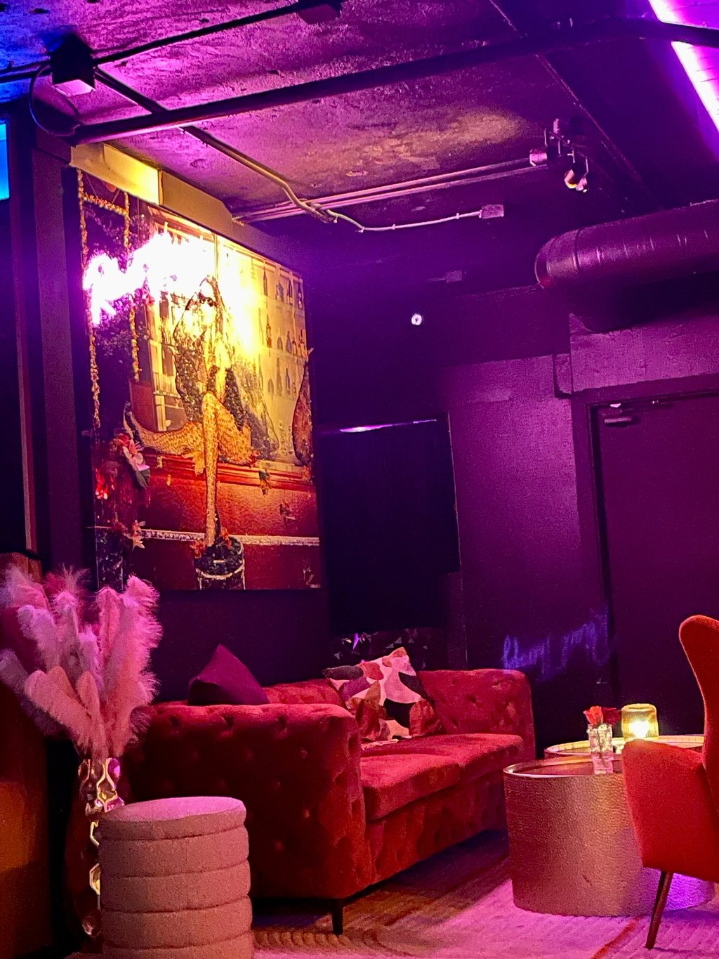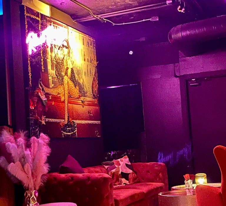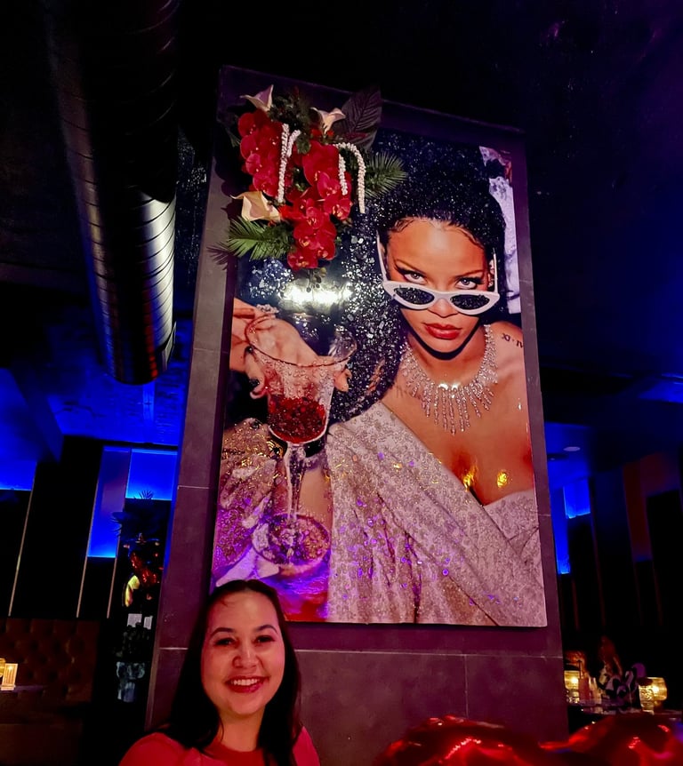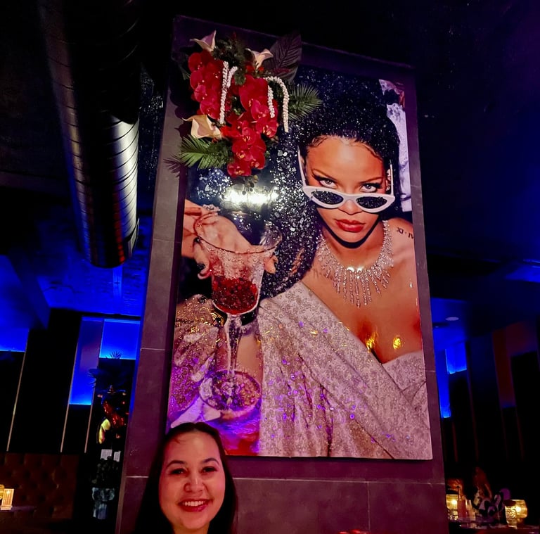 If you’re looking for a swanky, modern cocktail lounge, this is it. After passing through a mirrored door, you’re transported into a luxurious space filled with neon lights, velvet furniture, and colorful photos of celebrities that sparkle with sequins. Smooth R&B plays in the background, and the staff are dressed in clubwear with full makeup. It reminded me of a high-end lounge in Las Vegas.