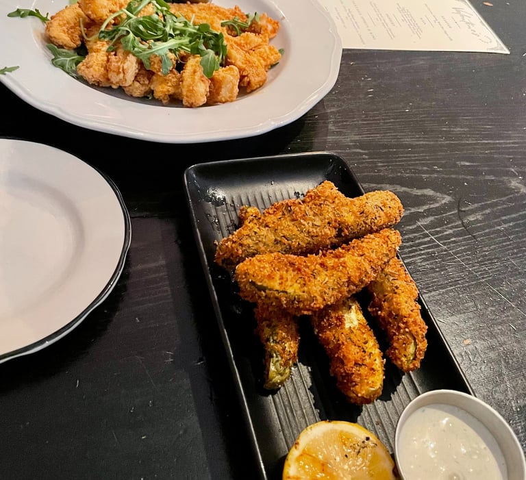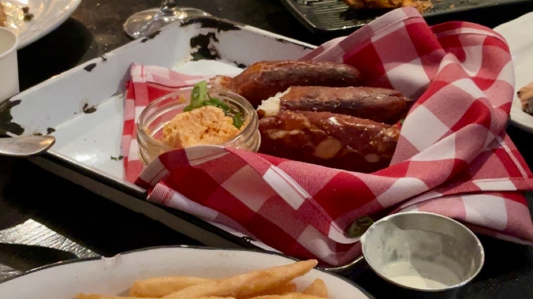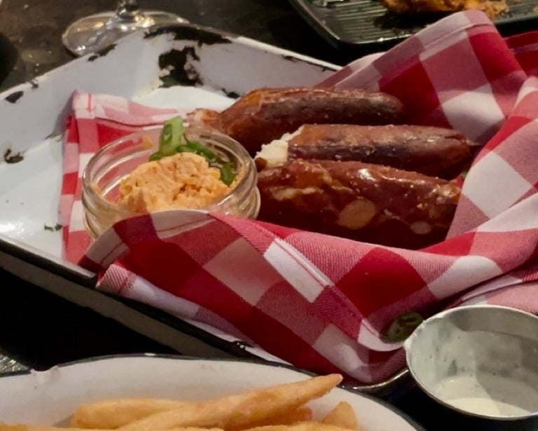 Situated in an older brick building, Moonshine Grill serves savory dishes with a Southern flair. We thoroughly enjoyed our appetizers, which included panko-fried pickle spears with creamy ranch, crispy calamari, and buttery pretzels with whipped pimento cheese. The entrées were just as mouthwatering, including a hot honey chicken sandwich and blackened catfish with grits. The full bar offered a variety of cocktails, such as espresso martinis, Old Fashioneds, and even frozen hard lemonade.