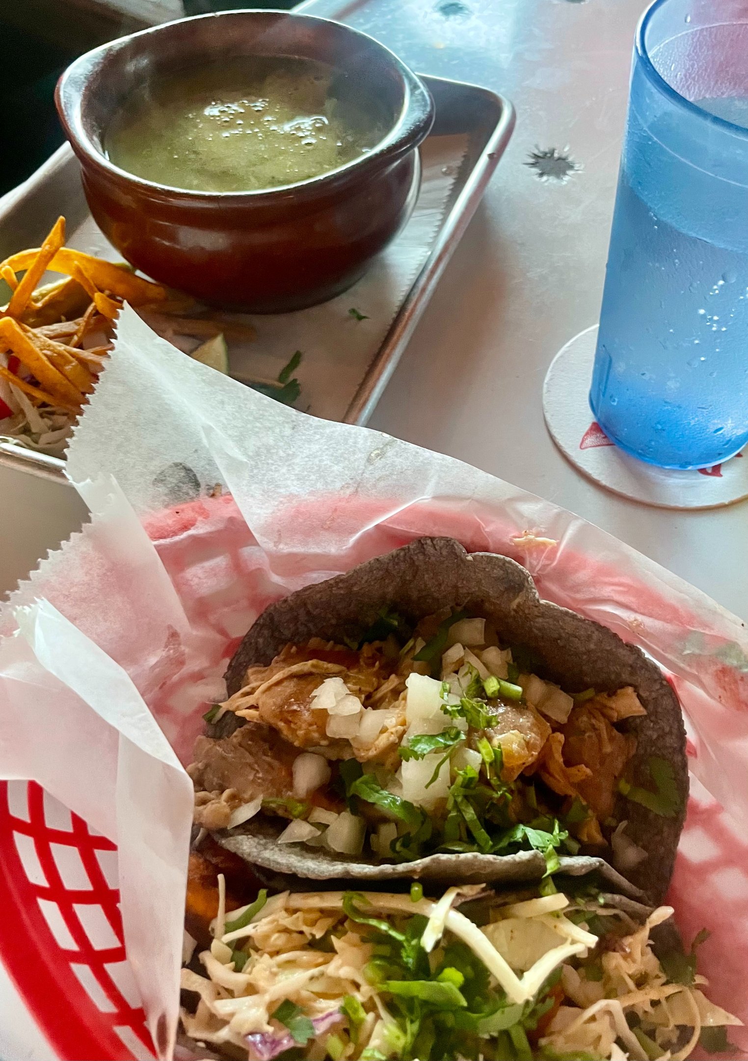 We each ordered a few tacos, which were generously sized. Options include barbacoa, carnitas, fish, sweet potato, chicken, and birria, among others. The tacos can also be served on a homemade blue corn tortilla, which was chewy and fresh.