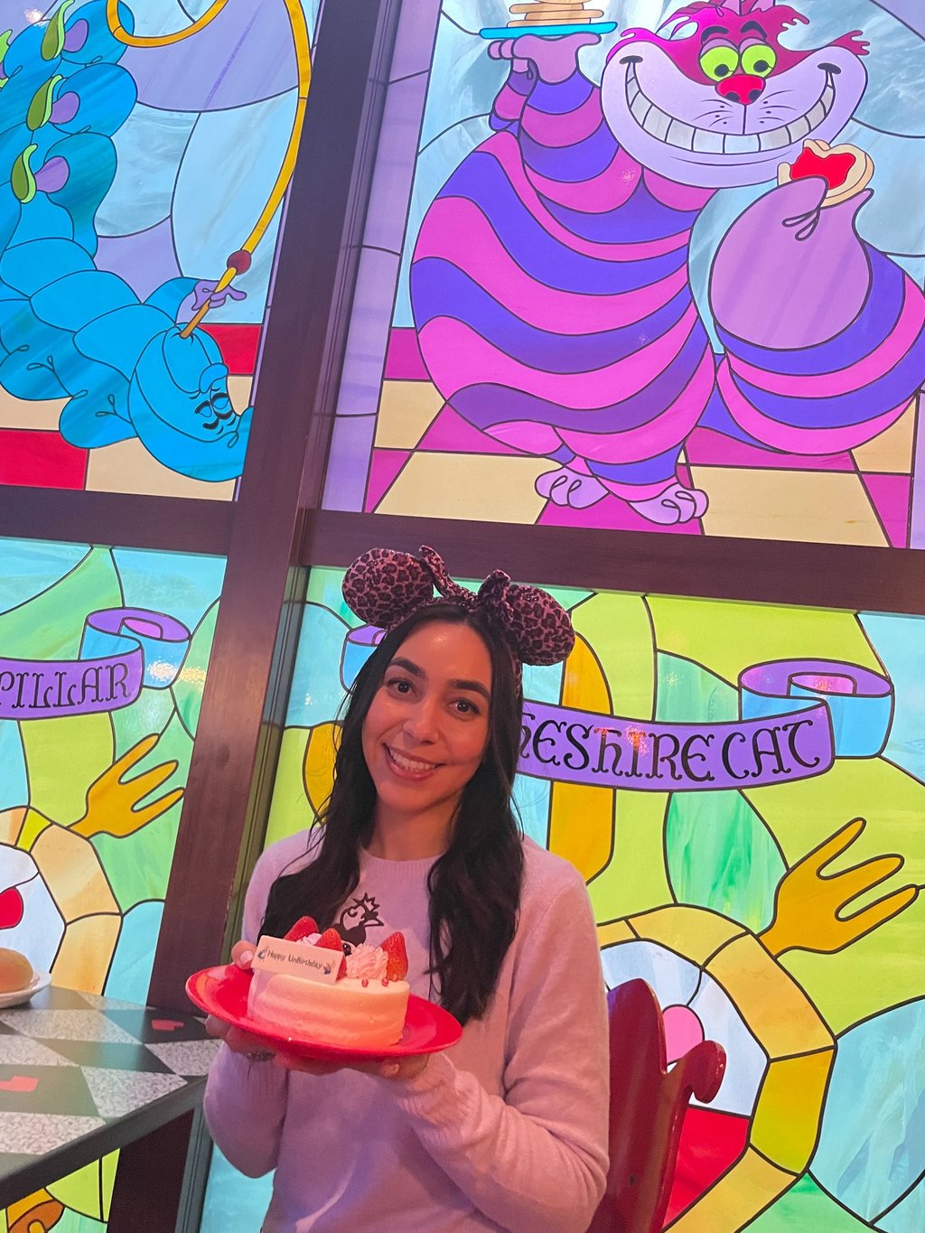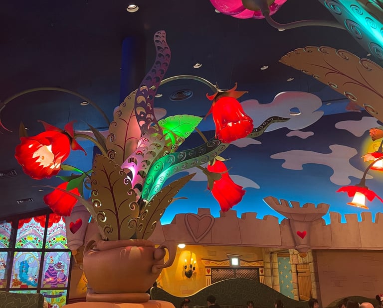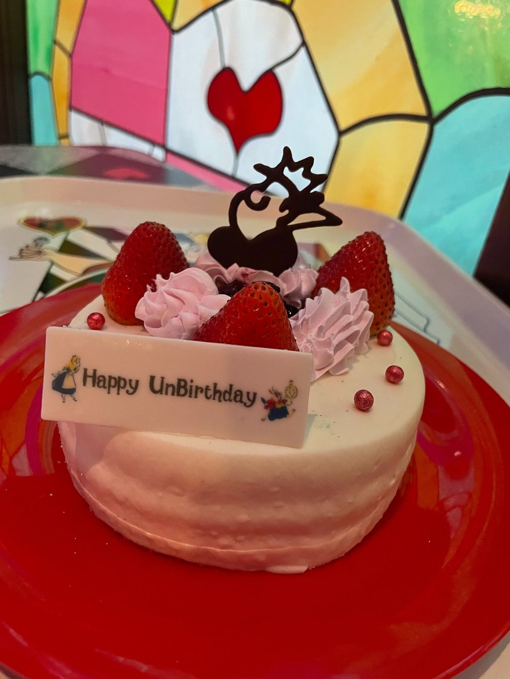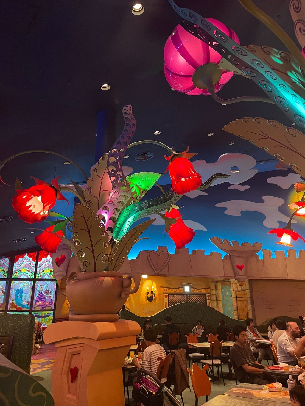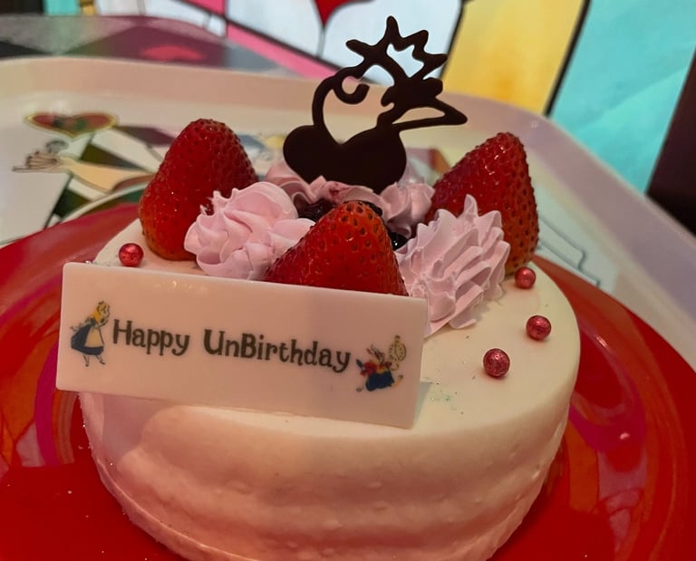 I really enjoyed my experience at this Alice in Wonderland–themed restaurant at Tokyo Disneyland. The food is served buffet-style, with entrée options such as roasted chicken, flank steak, meat patty with cheese, and swordfish. I chose the chicken, which was very juicy and flavorful. There were also fun dessert options, including strawberry mousse served with a souvenir plate and a Happy Unbirthday fruit basket cake. The cake was available in both large and small sizes and was topped with fresh strawberries and whipped cream icing. It was light, sweet, and very enjoyable. You definitely get a lot of food for the cost (entrées are around $12 USD), making this a great spot for lunch or dinner.