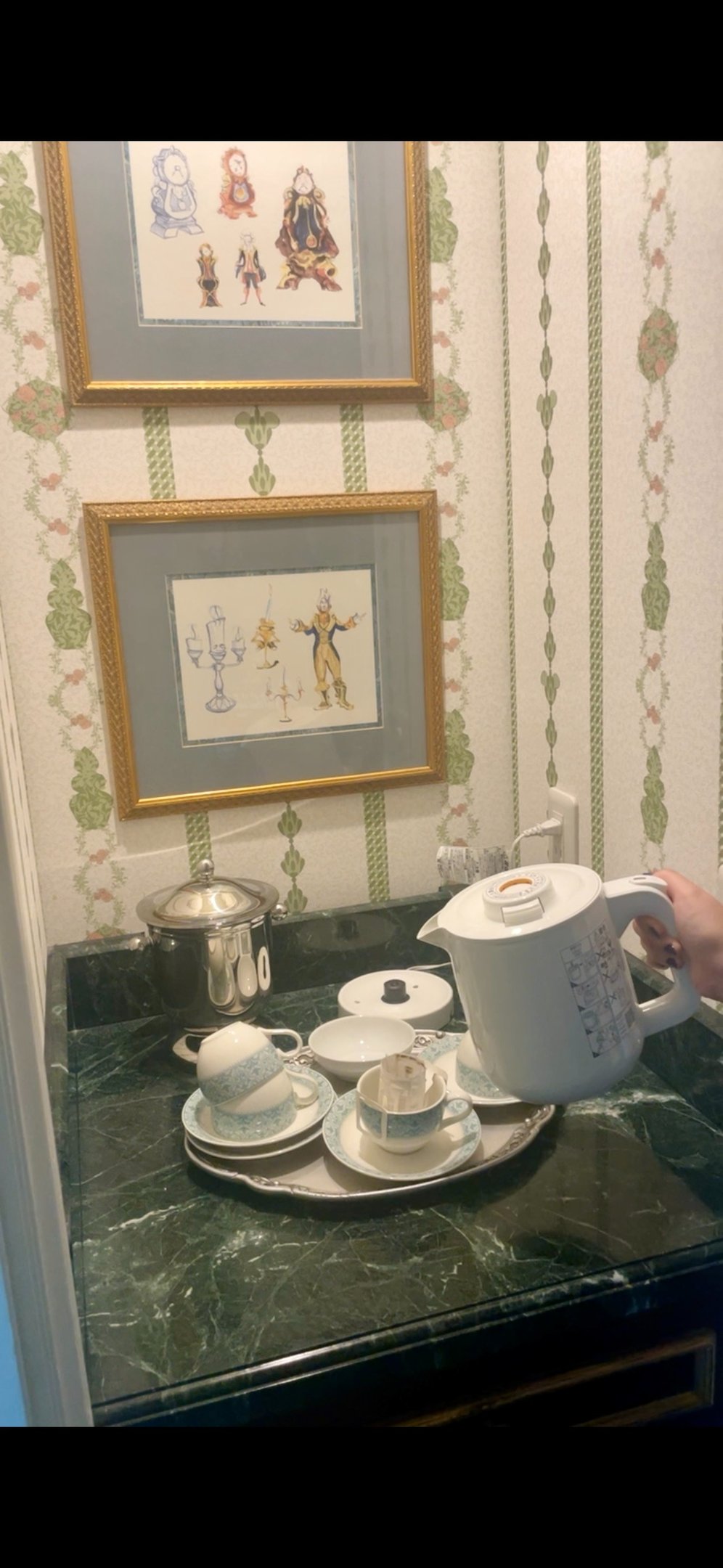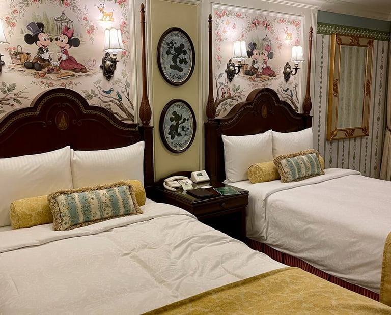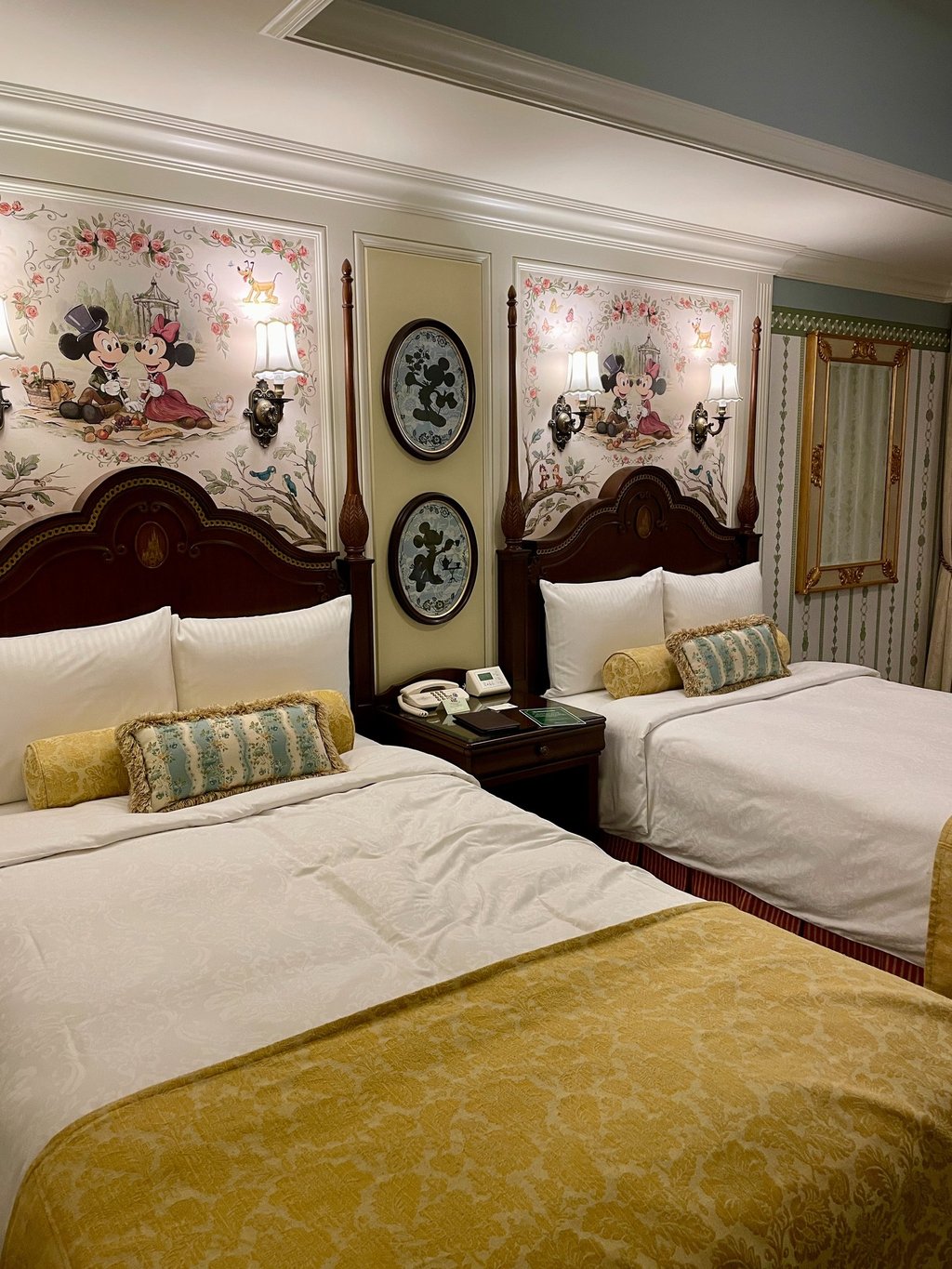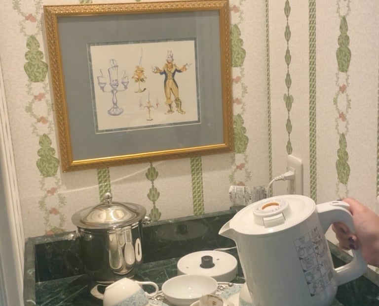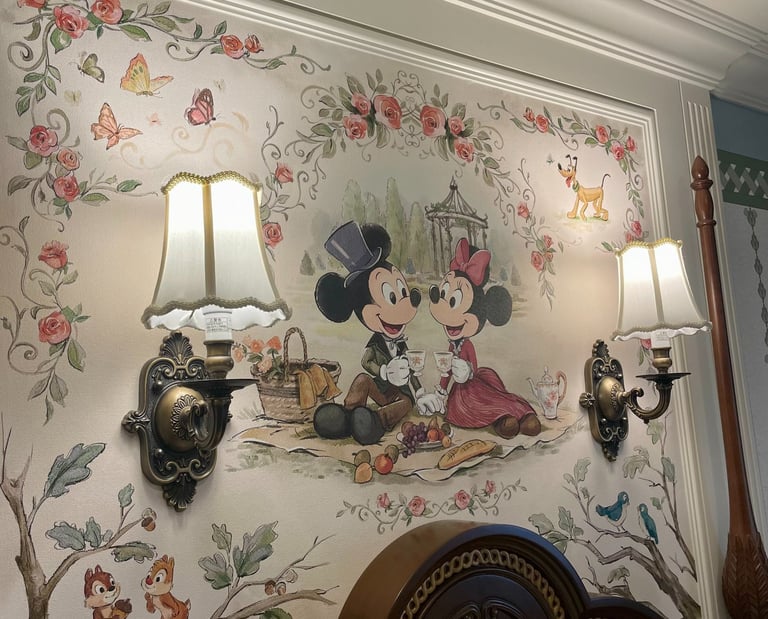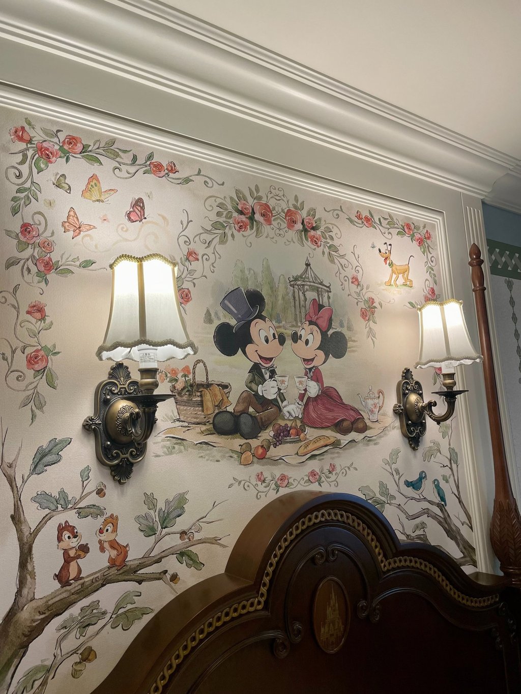 The guest rooms are filled with thoughtful details, including hidden Easter eggs such as Mickey ears incorporated into the furniture and painted onto the walls. Our room featured a classic Mickey and Minnie theme, though other rooms offer more whimsical designs, such as Alice in Wonderland. We were able to take home complimentary, hotel-specific souvenirs like small plastic cups and metal tins filled with Disney toiletries. I especially enjoyed having a vanity desk as a designated space for doing makeup, and I also loved the painted teacups—which we ended up using for tea, coffee, and even wine.