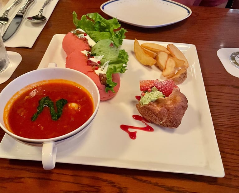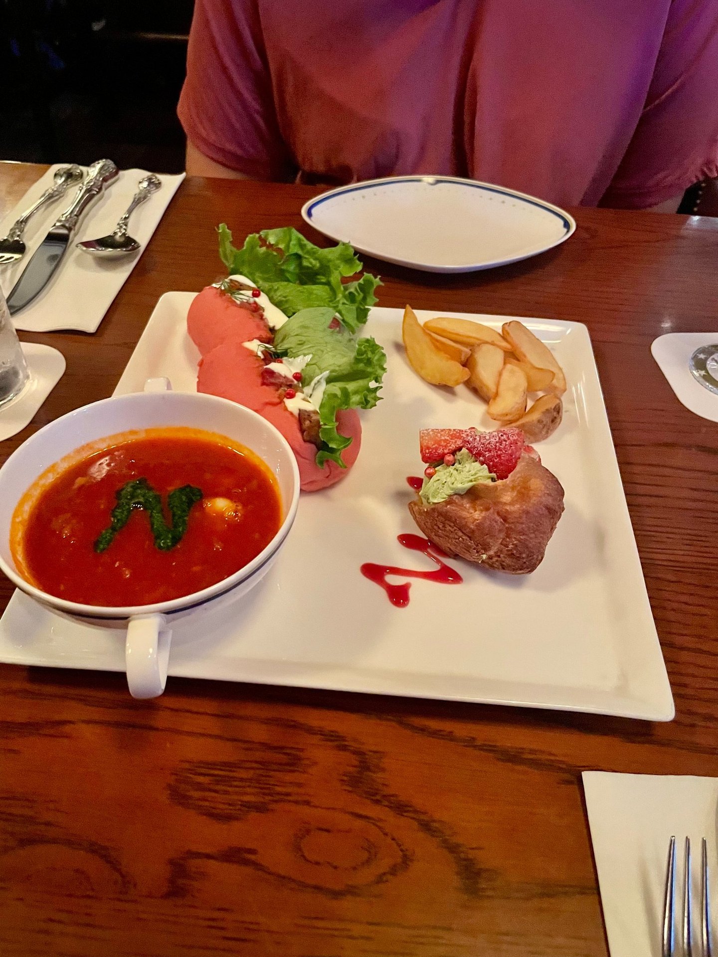 While the appetizer options are limited and there is typically only one meal choice (usually a sandwich paired with sides), this setup allows for quick service. During our visit, the meal was a pork sandwich served with lobster bisque, fries, and a cream puff pastry for dessert. The food was excellent and perfectly portioned for lunch.