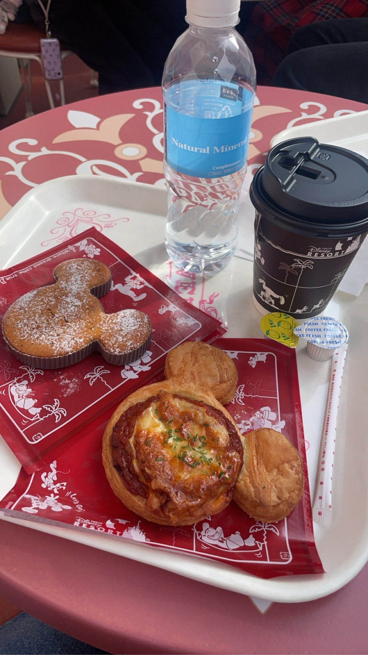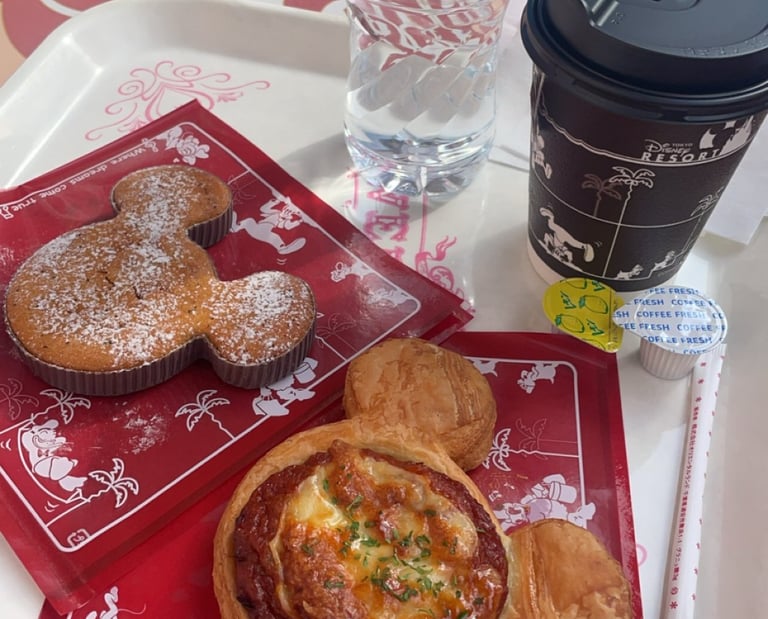 The Sweetheart Cafe in the World Bazaar area is a counter-service bakery offering both sweet and savory treats. We stopped here in the morning for coffee and paired it with some Mickey-shaped items: a banana and walnut muffin and a meat patty with cheese Danish. Both were tasty, and it was nice to move through the counter quickly.
