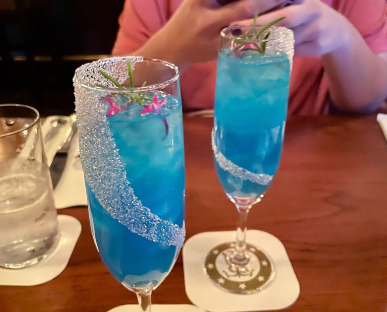 If you’re looking for a swanky meal with great food and drinks, the Teddy Roosevelt Lounge is an excellent choice. Located on the second floor of the S.S. Columbia ship replica, this lounge features a full bar with rotating signature drinks. We chose a bright blue signature cocktail topped with sugar crystals swirling around the glass—it was so beautiful that I almost didn’t want to drink it.