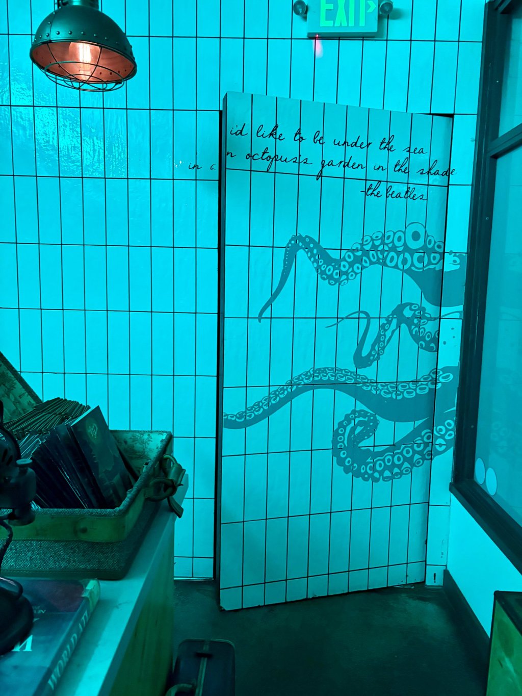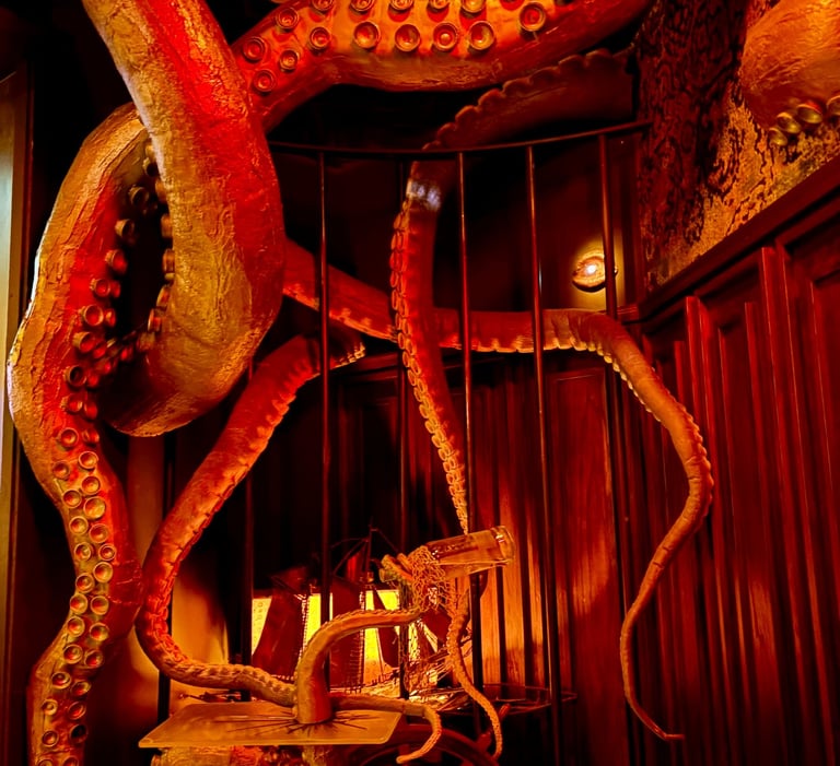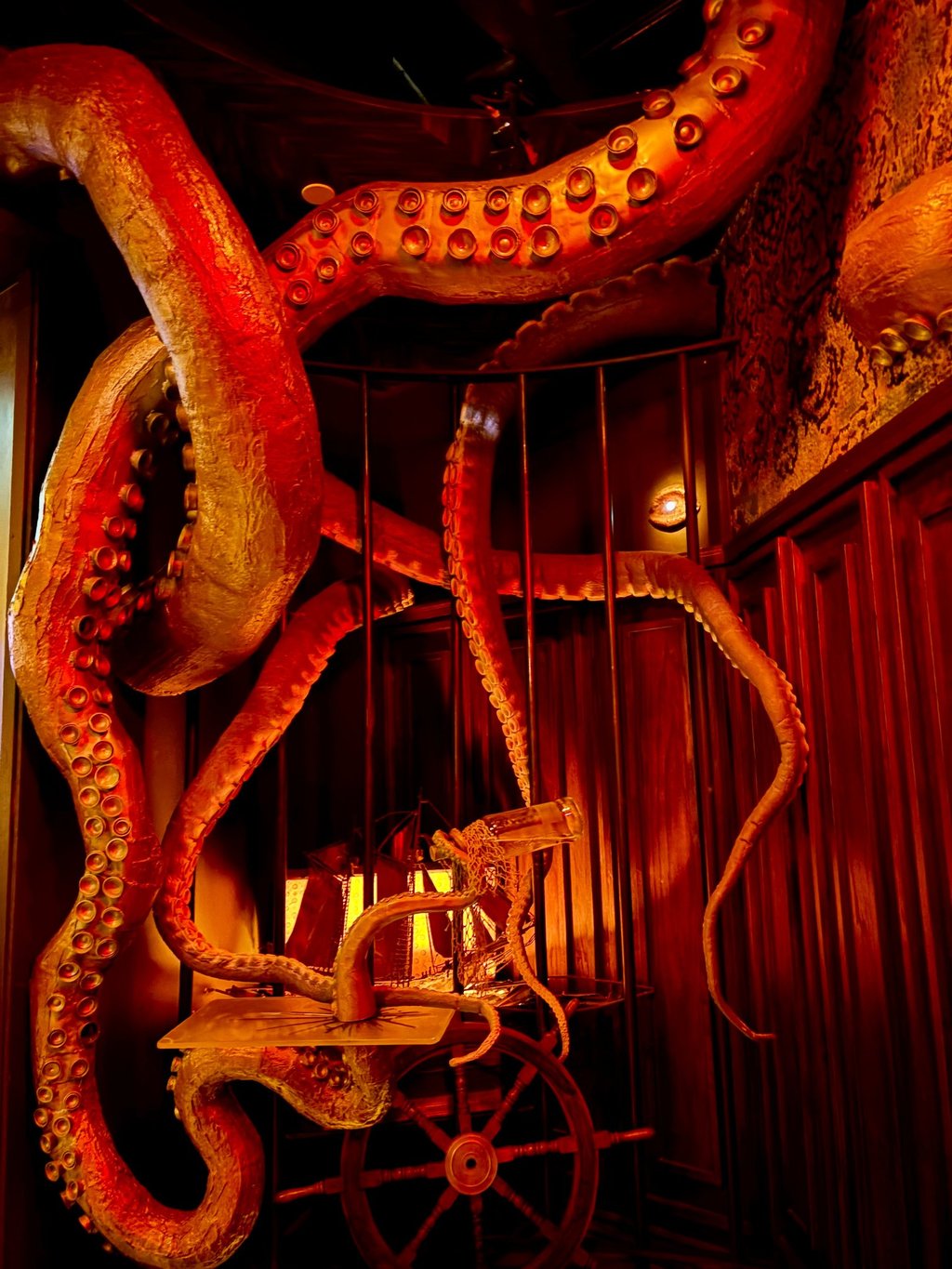 After stepping through a door made of kitchen tile, Captain's Quarters transports you to the inside of a pirate ship. The interior is made of polished wood, and the open ocean peers through fake windows. Tentacles from a giant octopus dangle from the ceiling, and painted captain's portraits give off eerie, Disney Haunted Mansion vibes.