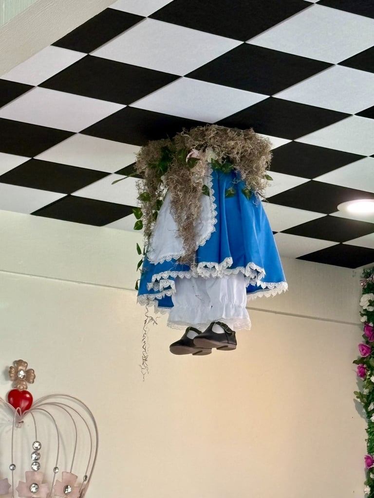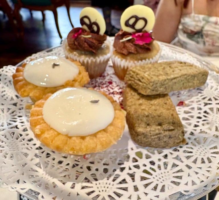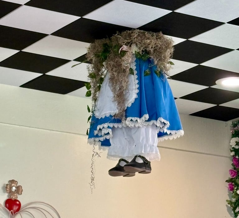 The Britannia Tearooms serves afternoon tea in a space that has an Alice in Wonderland theme. Clocks line the hallway, the Mad Hatter and the Queen of Hearts are painted on the wall, Alice's legs dangle through the ceiling, and a tiny replica of the smoking caterpillar sits on a mushroom. The atmosphere is both fun and relaxing, with lots of things to look at. Even though Alice is a popular character, Harry Potter fanfare can also be found throughout the space. For instance, Moaning Myrtle lurks in the women's restroom, should you decide to brave her.