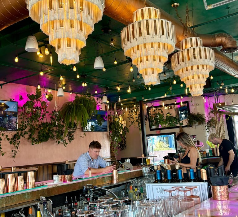 Flamingo Deck is a vibrant bar and restaurant in Pacific Beach. Centered around flamingos, the décor is a mix of tropical and modern contemporary. Plants hang throughout the space, and there is even a lounge section with cushioned chairs and pillows. This place gets packed as the evening begins, and it has a clubby atmosphere once the sun goes down.
